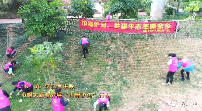 环境清洁—— 16点,在官庄畲族乡的樟树林里及汀江河道边,“巾帼护河”志愿者们或拿着扫把清扫垃圾,或扛着锄头清洁河道。由2560名巾帼志愿者组成的123支“巾帼护河志愿者服务队”,全年开展爱河护河志愿活动近500次。