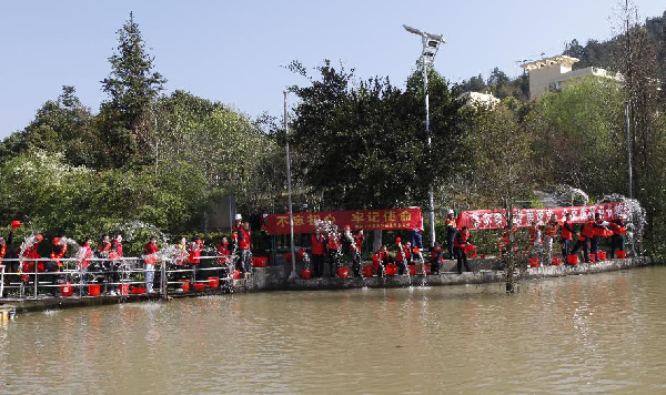 在金山水电站库区,党员干部和志愿者们集中开展增殖放流活动,放流鱼苗近万尾,以实际行动?;に肪?,引导人们保护汀江生态环境,维护母亲河健康生命。