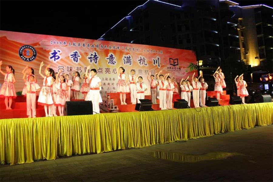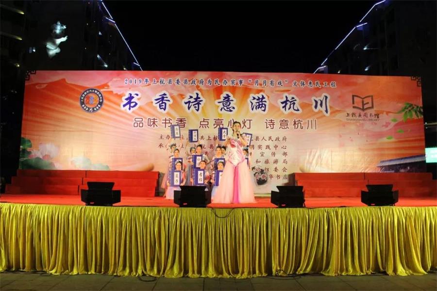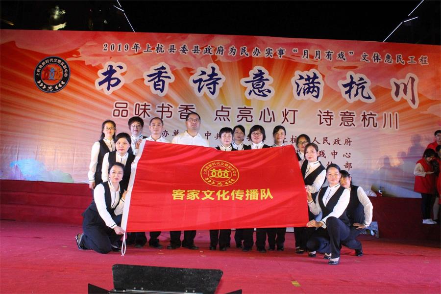 客家文件传播队志愿者合影 ?整场晚会分为致敬经典、快乐阅读、情满杭川、学习强国四个篇章。晚会在经典诵读《经典墨香传古韵》中拉开了序幕,耳熟能详的经典诵读,配以古琴、舞剑、书法、毛笔武术等表演形式,震撼的表演赢得全场喝彩。读经武术表演《演武诵道》、情景剧《黎黎姐姐讲故事》、讲故事《狼和小羊》、相声《大与小》、诗歌《客家人》、独唱《家风》、诗歌朗诵《祖国,你就是我要唱的那首歌》、说唱表演《大中国》、诗朗诵《少年中国说》等一个一个精彩节目轮番上演,活力四射、震撼人心。晚会在悠扬的《上杭县图书馆之歌》歌声中落下帷幕,历时90分钟的演出,不仅内容丰富,形式多样而且每一个节目都充满着浓浓的书香气息,精彩纷呈的表演,赢得全场掌声连连,受到了观众好评。