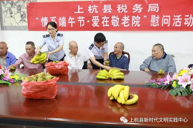 ??? 为深入开展新时代文明实践活动,进一步传承中华优秀传统文化,端午节期间,上杭县组织开展了“浓情端午”系列志愿服务活动。 情系端午节,爱在敬老院 6月6日上午,上杭县税务局志愿者前往养心园护理院开展“情系端午节,爱在敬老院”慰问活动?;疃?,志愿者们为老人带来了前一日亲手包的爱心粽子及老人们最爱的香蕉,陪老人拉家常,并送上了节日的祝福。