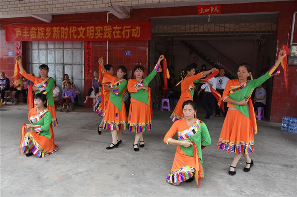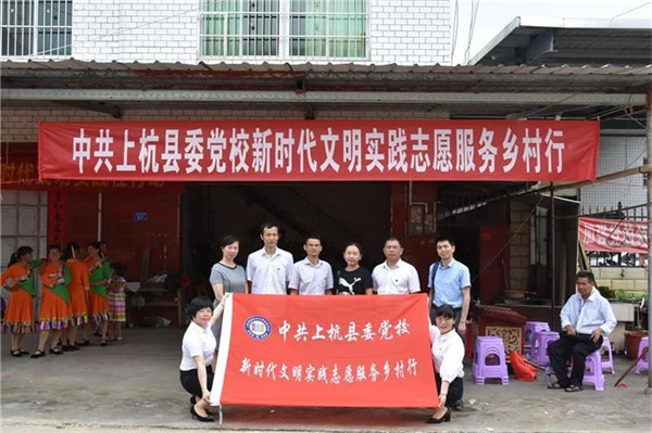 “红土铸魂”志愿服务队成员合影 李桂香 摄 7月20日上午,上杭县委党?!昂焱林辍敝驹阜穸幼呓嵯绾岣诖蹇埂叭笮摹毙仓驹阜窕疃??;疃?,志愿服务队队员通过演讲上杭红色小故事《障云忠魂—阙桥书》,微课堂《习近平新时代中国特色社会主义思想》授课,演唱客家山歌《苏区干部好作风》及爱国歌曲《我和我的祖国》等活动开展志愿服务。同时,庐丰乡横岗音协会表演了合唱、民乐合奏、竹板及舞蹈等精彩节目,活动受到了当地群众的欢迎。