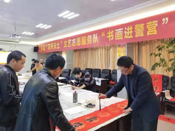 为进一步增进警民友谊,丰富警营文化生活,1月2日下午,上杭县“花开沃土”文艺志愿服务队深入到县公安局城关派出所开展书画进警营笔会活动。 活动中,书画艺术家宋展生、温文茂、张杏夫等11名志愿者挥毫泼墨,“厚德载物”“格物致知”“一帆风顺吉星到 满室花香喜事临”......一幅幅洋溢着新年喜气,饱含浓浓墨香的楹联跃然纸上。志愿者们精心创作了三十余幅精美的书画作品、新春对联赠送给基层民警,向基层民警送上了衷心的新年祝福。 通过此次“书画进警营”笔会活动,让基层民警了解书法、走进书法,丰富了基层民警的文化生活,推动了警营文化的繁荣发展。(上杭县委文明办马兆湘 钟卫波) |