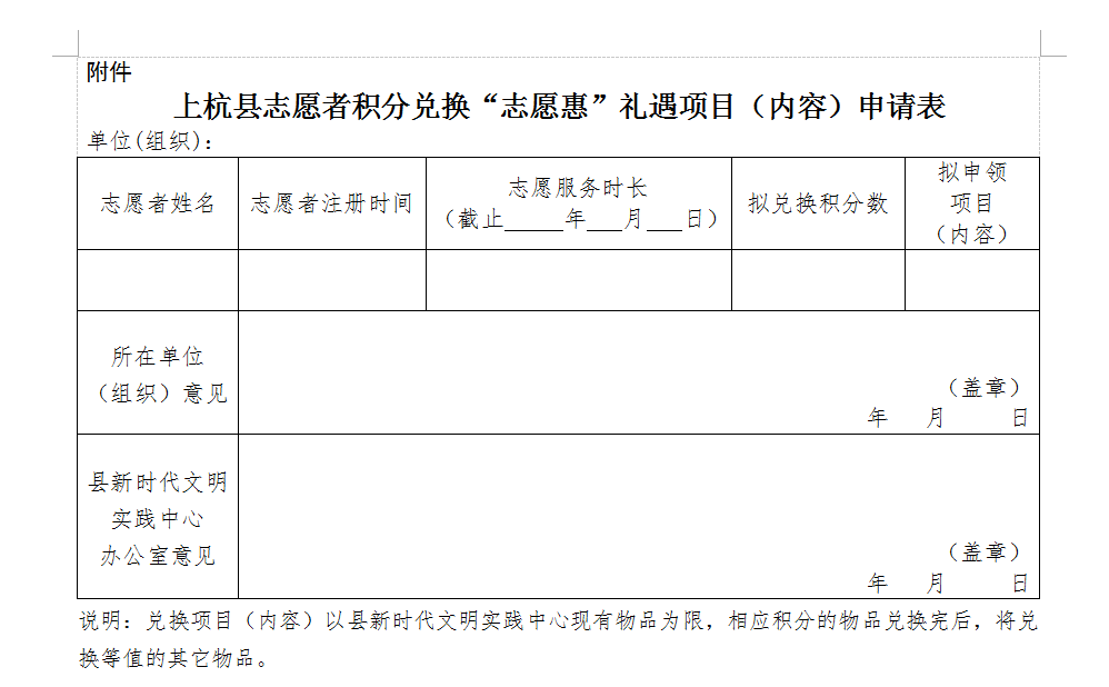 附件:上杭县志愿者积分兑换“志愿惠”礼遇项目(内容)申请表