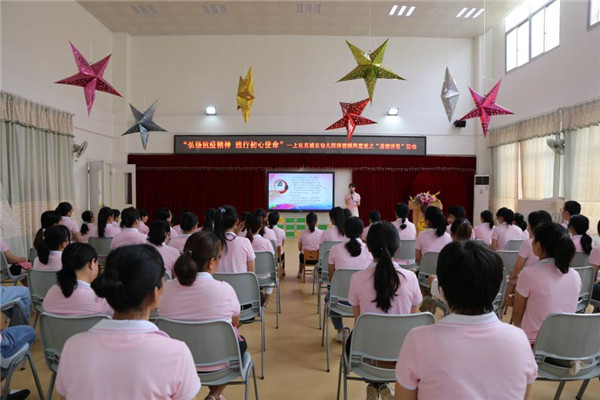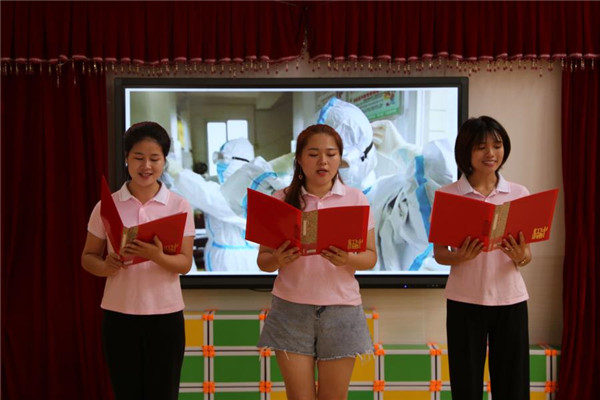 本期道德讲堂共有六个环节,分别是作省身、学模范、谈感悟、诗朗诵、唱歌曲、作表彰。作省身环节。省身是一种自律,一种修养,更是一种情操,一种坦荡。全体教职工在主持人直击心灵深处的“开场三问”中,微闭双眼,右手放在胸口上,静默自省,叩问自己的心灵。学模范环节。在这场没有硝烟的战“疫”中涌现出许多最美逆行者。通过观看视频短片《抗疫英雄钟南山》和聆听上杭县抗疫天使黄晓琴的故事,让教职工们进一步的感受到战“疫”一线的先进典型和平凡英雄就在我们的身边,他们舍小家为大家,挺身而出积极投身于疫情防控一线,用无声而有力的事迹行动默默奉献出自己的一份力量,?;ぷ湃嗣袢褐诘陌踩?。谈感悟环节。这些榜样和力量,谱写了最壮丽的爱国主义精神诗篇,他们勇于担当、敬业奉献的精神,值得全体教职工学习,大家深受感触,纷纷发表自己感悟。唱歌曲环节。歌声能给我们带来温暖和力量,全体教职工共唱歌曲《听我说谢谢你》,用最美的歌声表达对无数抗疫英雄无私奉献的崇高敬意。作表彰环节。在疫情防控延期开学期间,我园涌现出一批身体力行,无私奉献的“优秀工作者”。她们用自己的方式,在平凡的岗位上彰显“齐心协力战疫情 ,爱岗敬业显担当”的精神。经民主推选,综合评议,评选出七名优秀工作者。