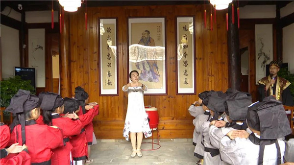 活动现场,参加开笔礼的学童们挺直腰板,排着整齐的队伍,随着主持人宣布“仪式正式开始”,开笔礼拉开序幕。在第一个环节“正衣冠”中,学童们有模有样地整理自己的衣装。引导学童拜谒孔子圣像后,启蒙师长用毛笔蘸上朱砂在学童们的额头正中点上红痣“开天眼”,并敲响启智鼓。随后,学童们端坐执笔,认认真真学写“人”字,齐声诵读《三字经》。