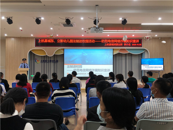 为深入开展电信网络防诈骗宣传教育活动,提高广大群众识骗防骗的意识和能力,形成家园携手、全民动员参与、共同抵制各类电信网络违法犯罪活动的社会氛围。2020年10月30日,上杭县城东幼儿园邀请法制副校长——上杭县城郊派出所教导员李小生走进隶属园(上杭县立新幼儿园)为教职工和家长们进行“防范电信网络诈骗知识”宣讲活动。