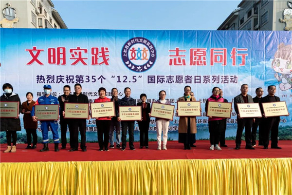 十佳志愿服务项目颁奖活动现场 为全面贯彻落实习近平新时代中国特色社会主义思想和党的十九届五中全会精神,进一步弘扬“奉献、友爱、互助、进步”的志愿精神,营造“人人为我 我为人人”志愿服务氛围,12月5日,由上杭县新时代文明实践中心指导,县委宣传部、县委文明办、团县委、县妇联、县总工会联合在城区瓦子街广场举办“文明实践·志愿同行”国际志愿者日系列活动,县新时代文明实践中心副主任、县政府副县长蓝玉华参加活动。