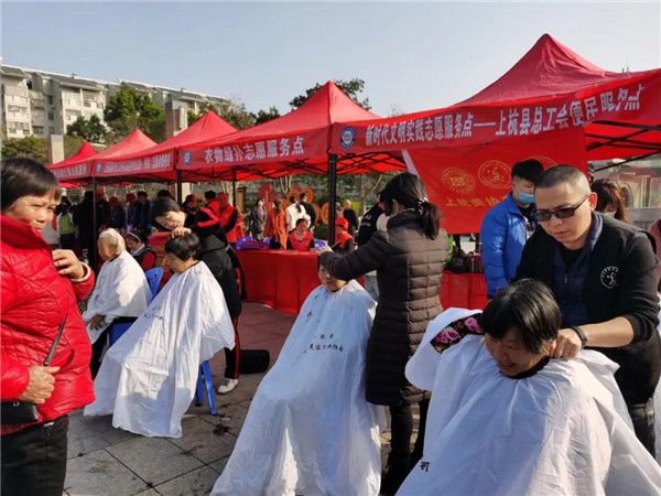爱心义剪活动现场 启动仪式上,举行了第二届上杭县新时代文明实践志愿服务项目大赛“优秀志愿服务项目”和“十佳志愿服务项目”的表彰,为“十佳青年志愿者”个人颁发了奖杯,同时开展礼遇志愿积分兑换活动。