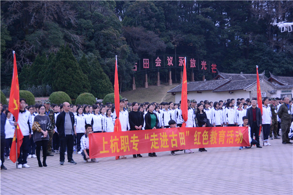 2018年12月27日上杭职专组织2018级新生开展“走进古田”红色之旅活动 3.创新细化管理模式,完善协调联动机制 成立家长委员会,完善家校联系制度,建立班级家长微信群??沽司9步?、检校共建,双拥共建活动。发挥共青团、学生会和学生社团的作用,50多个社团活动极大丰富了学生的业余生活。创新了德育全员帮扶的细化管理模式,坚持校级领导(支委)挂钩帮扶科系,行政(党员干部)挂钩帮扶班级,教师(党员)挂钩帮扶潜能生的“三挂钩”制度和学生民主评议教师、教师民主评议领导干部的“两评议”制度,形成教育合力。 二、强化思想道德教育,提升德育工作效果 1.培育和践行价值观, 引领德育教育实践 将社会主义核心价值观融入到学校教育教学的各个方面,加强思政课程和课程思政建设,结合文体活动深入开展“中国梦”宣传教育,加强党史国情的教育;打造以“墨斗文化”为核心的特色校园文化建设,传承红色基因,弘扬传统美德,培育工匠精神。成立“龙岩市唐玉泰名校长工作室”,由原校长唐玉泰同志担任龙岩市中职德育学科中心教研组组长,每年定期召开全市中职思政课教师教研活动会议,积极推荐思政课老师参加省市思政课教育教学研讨活动。在疫情防控期间,针对防控形势,积极开展校园爱国卫生运动,宣传“文明健康,有你有我”健康意识,同时加强“四个自信”教育,增强学生爱国情。