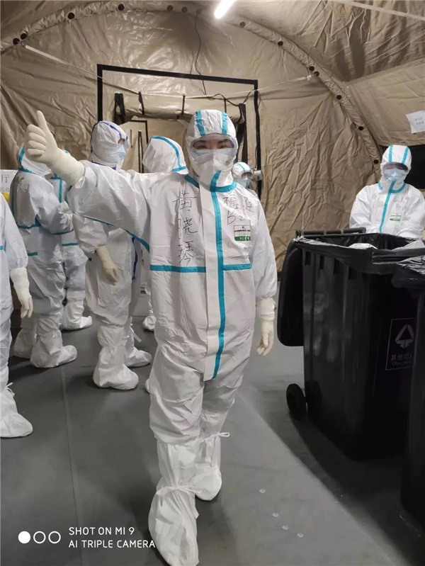 身穿防疫服的黄晓琴 新冠肺炎爆发后,面对突如其来的肺炎疫情,她主动写下驰援湖北的请战书。2020年2月4日上午,县医院接到上级关于组派护理专业医疗队援助湖北应对新型冠状病毒感染的肺炎疫情的指令后,立即发出征召护理人员的通知,并最终选派黄晓琴护士出征驰援湖北。因为时间紧急,在不到一个半小时时间,黄晓琴即整理好行囊出发,当天晚上,她就随福建省援助湖北护理专业医疗队飞抵武汉。 对这位已从事临床护理工作13年的黄晓琴来说,她始终把自身的职业与共产党为人民服务的宗旨联系在一起。此次疫情来袭,她初心不改,毅然决然报了名,出征前,她就下定决心,一定不辱使命,圆满完成任务。到达武汉的第二天,黄晓琴郑重向福建省援鄂护理专业临时党支部递交入党申请书,这是在“火线”上写下的入党申请书,也是一份战“疫”宣战书。 她所在的福建省支援湖北抗击新冠肺炎专科护理队负责支援的是武汉东西湖方舱医院,是为了这次疫情应急,临时在武汉客厅搭建的医院,环境相对简陋,有2000张床位,主要是收治轻症的确诊新冠肺炎病人。福建护理专科团队负责舱内A厅的B区和D区,共230个床位。在方舱医院,她与队友团结合作,同心协力、英勇奋斗、攻坚克难、尽自己最大的努力,救助服务更多的患者,圆满完成支援任务,她所在的福建省支援湖北抗击新冠肺炎专科护理队获得国家三部委授予的“全国卫生健康系统新冠肺炎疫情防控工作先进集体”称号,黄晓琴同志被武汉客厅(东西湖)方舱医院评为“先进标兵”。