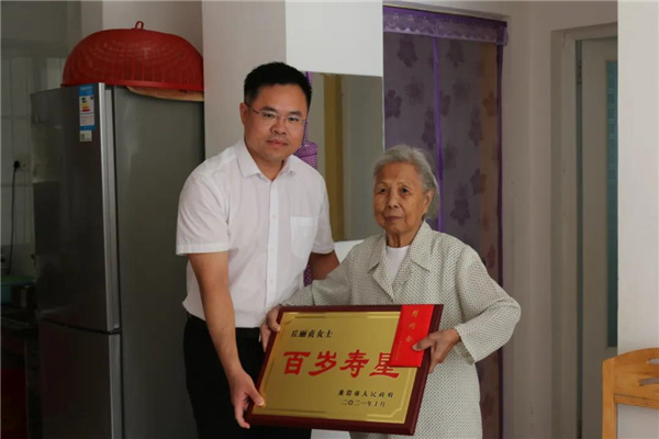 县长罗剑慰问丘丽贞老人 10月11、12日,县委书记王波、县长罗剑等县领导分别看望慰问百岁老人,为她们送上慰问金、慰问品以及“百岁寿星”牌匾,致以节日的问候和祝福,并通过他们向全县所有的老年朋友致以节日祝福和美好祝愿。 据了解,今年1一9月,上杭县又新增百岁老人20位,截至目前全县共有65位百岁老人。近年来,随着上杭经济社会发展和生态环境质量的不断提升,上杭县百岁老人数量越来越多。 翰墨抒情怀,丹青绘重阳