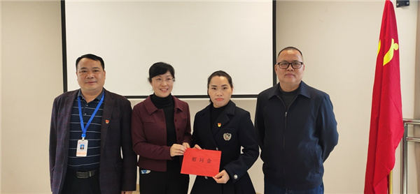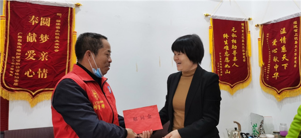 蓝玉华部长慰问福建省五星级志愿者阙荣锋 邱发锦摄 当天上午,蓝玉华还代表县委、县政府、县新时代文明实践中心前往上杭县义工协会、上杭县阳光公益协会、上杭县公益救援协会进行慰问。每到一处,蓝玉华都认真听取他们开展志愿服务活动情况的汇报,充分肯定他们取得的成绩,感谢他们为上杭县新时代文明实践中心建设所作的贡献,希望他们立足新时代、展现新作为,积极开展志愿服务活动,做实做响“爱满杭川”志愿服务总品牌。并对上杭县义工协会获评2021年福建省五星级志愿者阙荣锋进行了慰问,向他送上了慰问金。最后,蓝玉华向各协会志愿者以及全县的广大志愿者致以诚挚祝福,祝大家身体健康、阖家幸福、事业进步、万事如意!