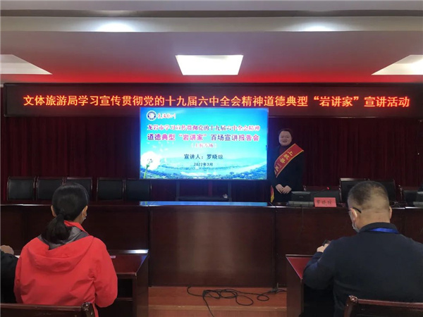 为学习宣传贯彻党的十九届六中全会精神,3月7日上午,龙岩市学习宣传贯彻党的十九届六中全会精神道德典型“岩讲家”百场宣讲活动走进上杭县文体旅游局,上杭县五好家庭、县委星火讲师团成员、县委统战部侨务股负责人罗晓琼作《党的十九届六中全会精神》宣讲,文体旅游局机关党委全体党员近60人参加。