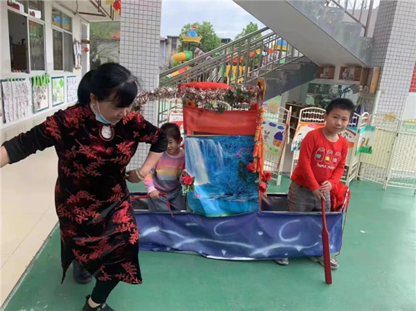 近日,上杭县湖洋镇中心幼儿园欢声笑语,洋溢着童趣童真的快乐氛围,孩子们一个个小大人模样,时而拿着船桨划船,时而拉着船缰拉船,跟着船灯非遗文化传承人林菊芳有模有样的表演着。为了此次教学,林菊芳特地制作了迷你版船灯和PPT课件,整个活动过程精彩纷呈,形象生动。