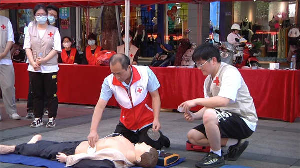 急救知识演示教学 在“应急救护——心肺复苏”现场培训区,培训师为志愿者和群众讲解和演示心肺复苏、气道异物梗阻等急救技能。 当天,志愿服务队还在实地开展了具有行业、单位特色的志愿服务,为广大群众义务理发、健康咨询、配钥匙、针线缝补、义诊等。