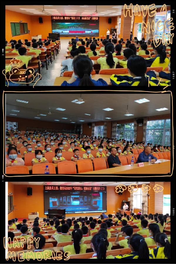 为引导广大少先队员厚植爱党、爱国、爱社会主义的情感,让红色基因、革命薪火代代传承,以更好的精神面貌迎接党的二十大胜利召开,连日来,上杭县各文明校园组织开展“喜迎党的二十大 强国复兴有我”主题教育活动。 蛟洋中心小学 9月15日,上杭县蛟洋中心小学开展“传承红色基因,喜迎党的二十大”主题教育报告活动。上杭县关工委、教育局、蛟洋镇关工委等领导出席活动。