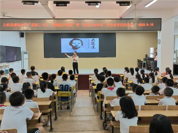 会上,县关工委德育报告员、省特级教师游增良为全校师生开展主题讲座。游增良用富有感染力的语言讲述红土地上时代英雄的故事,用榜样的力量,在师生心中种下一颗颗“红色种子”,引导同学们铭记红色历史、追寻红色足迹、传承红色基因、弘扬革命精神。 “今天的幸福生活来之不易,作为新时代的青少年,更要爱党爱国,坚定不移听党话、感党恩、跟党走,成为新时代的合格建设者和接班人?!崩醋粤昙兜某妈骱Пズ钋榈亟小扒氲撤判?强国有我”主题演讲。 红色薪火代代传,蛟小少儿心向党。这场生动而有意义的主题教育报告活动,把红色基因的种子播撒在孩子们的心田生根。立志向、修品行、练本领,高举队旗跟党走! 城东小学 9月15日下午,上杭县城东小学开展了“喜迎二十大 强国复兴有我”暨“追寻红色印记”红色故事宣讲比赛的活动。