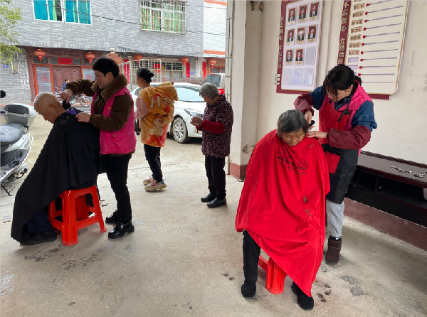 2022年1月26日,龙岩市上杭县古田镇红土巾帼志愿者在八甲村为高龄老人理发(拍摄者廖玲莉) “情暖古田 慈善爱心” ——慈善茶屋志愿服务项目 慈善茶屋志愿服务项目于2018年6月6日正式运营,由上杭县慈善总会、古田会议纪念馆、古田建发公司、古田消防中队、古田铁路派出所、古田巾帼志愿服务队、古田义工协会等单位共建,根据不同季节免费为游客和过往群众提供特色茶水,长年对外开放,节假日不休。