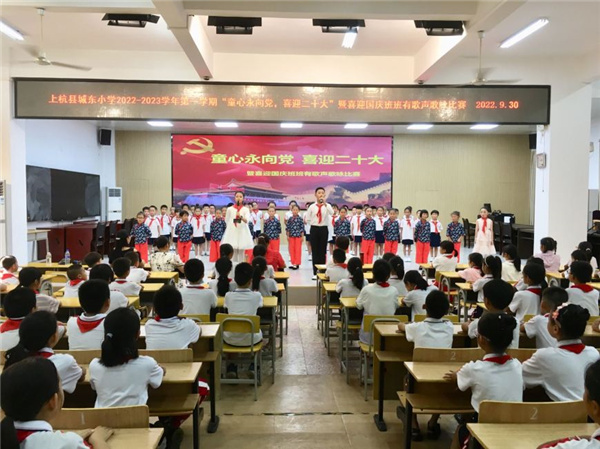 活动形式多样,内容丰富。9月24日举行了“向国旗敬礼”活动;9月25日各班开展了“喜迎国庆,爱我中华”主题班队活动;9月30日开展了“喜迎二十大,强国复兴有我”暨“追寻红色印记”研学活动等…… 活动的开展取得预期效果,孩子们纷纷表示要用实际行动“喜迎国庆,爱我中华”,努力使自己成为德智体美劳全面发展的好少年。 城西小学 9月28日,上杭县城西小学开展“传承红色基因,争做时代新人”暨“欢度国庆节,喜迎二十大”主题系列活动。 活动中,孩子们用端端正正的中国字欢庆新中国华诞,用一笔一画表达自己浓浓的爱党爱国情怀;用五彩画笔绘出美丽画卷;一曲曲节奏明快的乐曲、一首首红色歌曲传递了孩子们传承红色基因,争做时代新人的决心和信心;庄严神圣的升旗仪式,具体形象的讲述,铿锵有力的呼号,是孩子们为祖国建设添砖加瓦的决心! 本次活动有效激发了学生的民族自尊心、自豪感,更增强了学生的爱党爱国情怀。 白砂中心小学 9月30日,上杭县白砂中心小学在新市小学举行了“喜迎二十大,强国复兴有我”暨“追寻红色印记”演讲比赛。 在秋日阳光的沐浴下,小选手们怀着感恩的心,诉说自己对党的感激之情。感谢祖国给予幸福的生活。 活动结束后,镇宣传委员赖媛、白砂农商银行行长雷茶荣、白砂中心小学校长傅文华为选手们颁奖。 城东小学 9月30日,上杭县城东小学举行了“童心永向党,喜迎二十大”暨班班有歌声歌咏比赛。孩子们个个激情四射、歌声嘹亮,优美的歌声唱出了孩子们对伟大祖国的热爱和诚挚祝福,愿伟大的祖国繁荣富强。