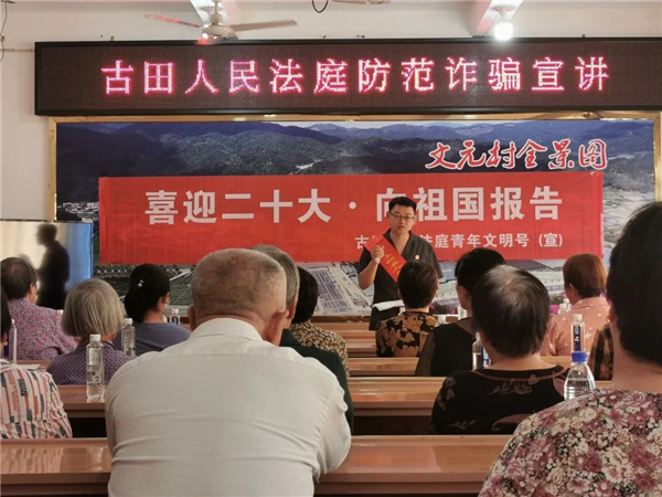 用心守护老年人“钱袋子” 为增强老年人防骗意识,近日,古田法庭青年文明号走进古田镇文元村、古田镇居家养老服务站等地,开展防范养老诈骗普法宣讲活动。