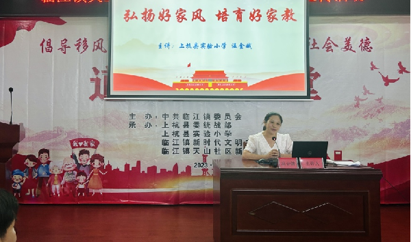 二、看视频 现场共同观看《闪亮的名字——2023最美家庭发布仪式》之肖春家庭的故事。这个家庭用实际行动破除人情陋俗,为邻里为社区为广大家庭树立了典范,用诚心感动着身边的每一个人,引领更多家庭积极践行移风易俗,弘扬文明新风。 三、听讲座 实验小学温金娥老师开展《弘扬好家风,培育好家教》讲座。她从家长层面深入阐述和分析家庭教育对孩子成长发展的重要性,提供了切实有效的家庭教育方法,分享了如何弘扬良好的家庭价值观和教育方式,以培养优秀的下一代。