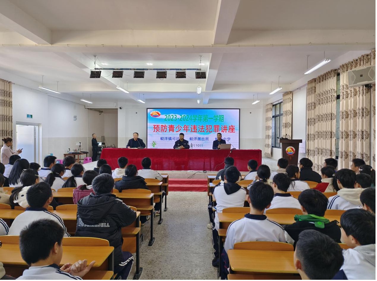 为了提高学生的法律意识和法治观念,1月10日下午,上杭县蛟洋中学联合蛟洋镇司法所、派出所共同举办预防青少年违法犯罪讲座,学校全校师生聆听了讲座。