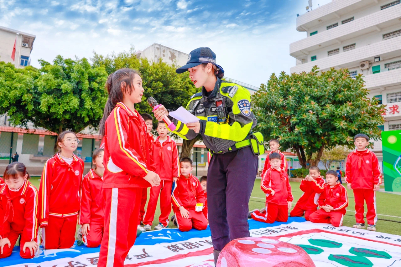“多少岁以上可以骑自行车上路?” “12周岁?!?/span> “回答正确,你可以继续前行。” 在紧接着的飞行棋游戏比拼中,宣传民警组织学生玩“交通安全飞行棋”,掷骰子,决定行走的步数。飞行棋盘上的每一步都写有交通安全常识,宣传民警在玩乐中讲解交通安全知识,让学生们在游戏比拼中学到该做什么,不该做什么。每一次骰子落地都伴随着同学们的欢呼声、呐喊声…… 交通安全小课堂开讲