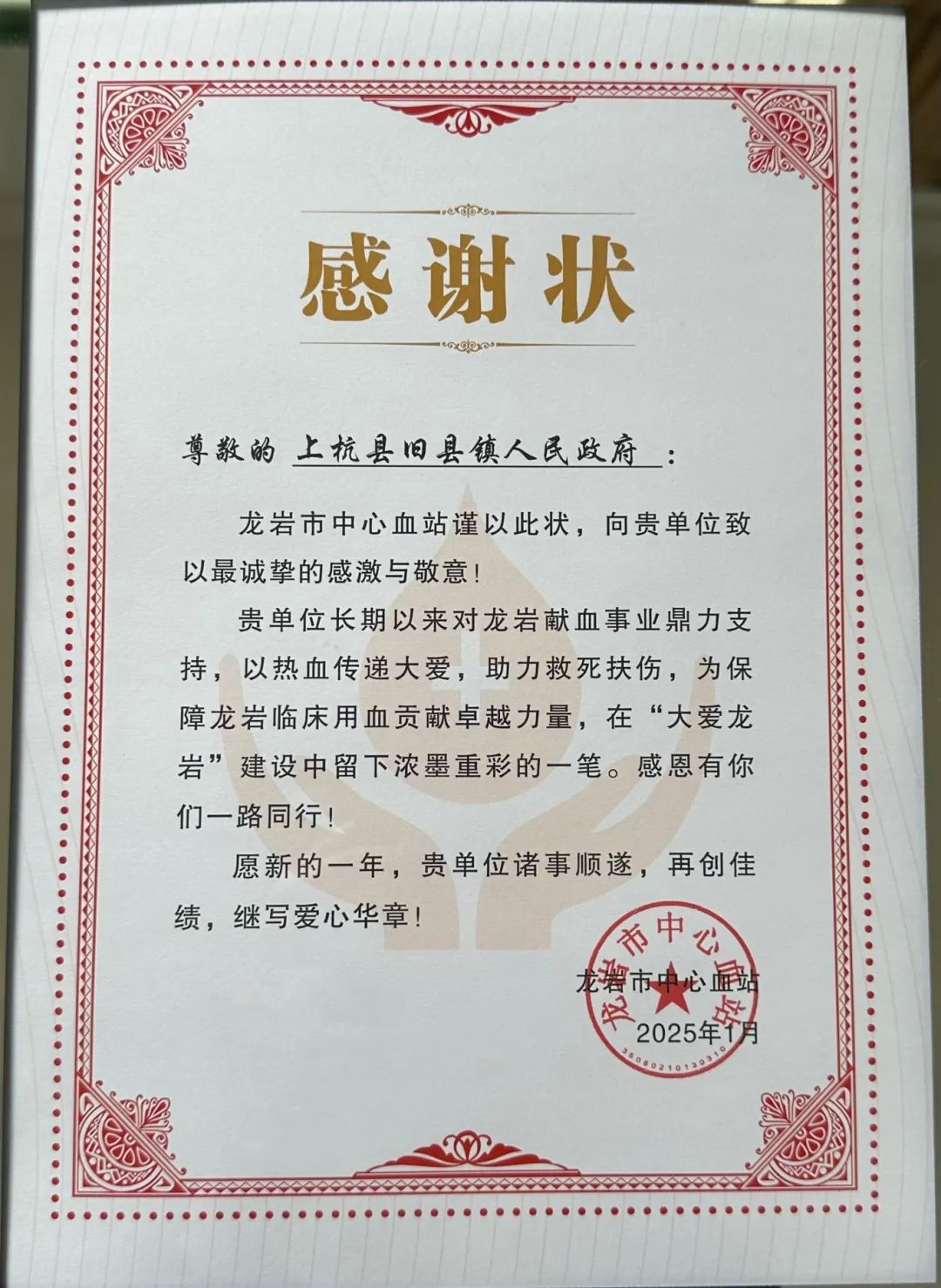 近日,旧县镇收到一封来自龙岩市中心血站的感谢状,信中对该镇积极参与无偿献血活动给予赞扬和感谢。