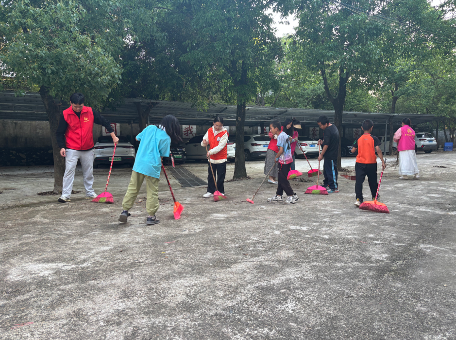 志愿者和孩子们共同观看宣传视频,学习“劳动楷?!笔录R约拔逅那嗄攴芏饭适?,为孩子们讲述“五一”劳动节的由来和24小时劳动者能做什么,让他们在交流互动中明白劳动的光荣。随后,志愿者们践行“五四精神”,带领学生们分组在校园里开展“垃圾清零行动”,他们手持扫把、畚箕,认真扫拾落叶、纸屑、杂物等各种垃圾,共同维护干净、整洁的校园环境,营造尊重劳动、崇尚劳动的良好氛围。