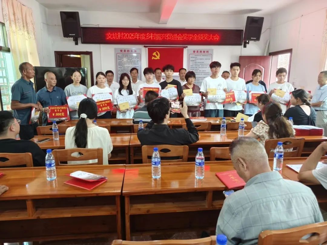 8月16日上午,通贤镇召开2025年度乡村振兴促进会奖学金颁奖大会,以表彰先进、激励后学,奏响乡村人才振兴强音。本次大会特别邀请到北京大学研究生张启良回村分享宝贵的学习经验,他结合自身求学经历,围绕“多复习、多复盘”等高效学习方法,向学弟学妹们进行了生动而实用的传授,为他们的求学之路提供了有益的借鉴和启迪。本次颁奖大会共为46名在学业上取得优异成绩的文坑学子发放了总额达五万四千余元的奖学金。据悉,这是文坑村连续五年举办乡村振兴促进会奖学金颁奖活动。 湖洋镇