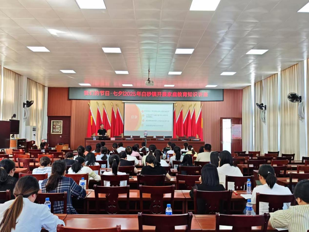 此次活动将传统文化传承与移风易俗有机结合,既让参与者感受到传统节日的文化魅力,又引导大家树立文明新风。下一步,旧县镇将继续以传统节日为契机,借助乡村文化会客厅的平台,开展更多形式多样的文化活动,让传统文化"活"起来,让文明新风"吹"进千家万户,为打造"多彩河湾·幸福旧县"注入文明力量。 白砂镇 七夕,在这个承载浪漫传说、象征家庭爱与传承的节日里,白砂镇开展家庭教育知识讲座,为家长送上“育儿指南”。