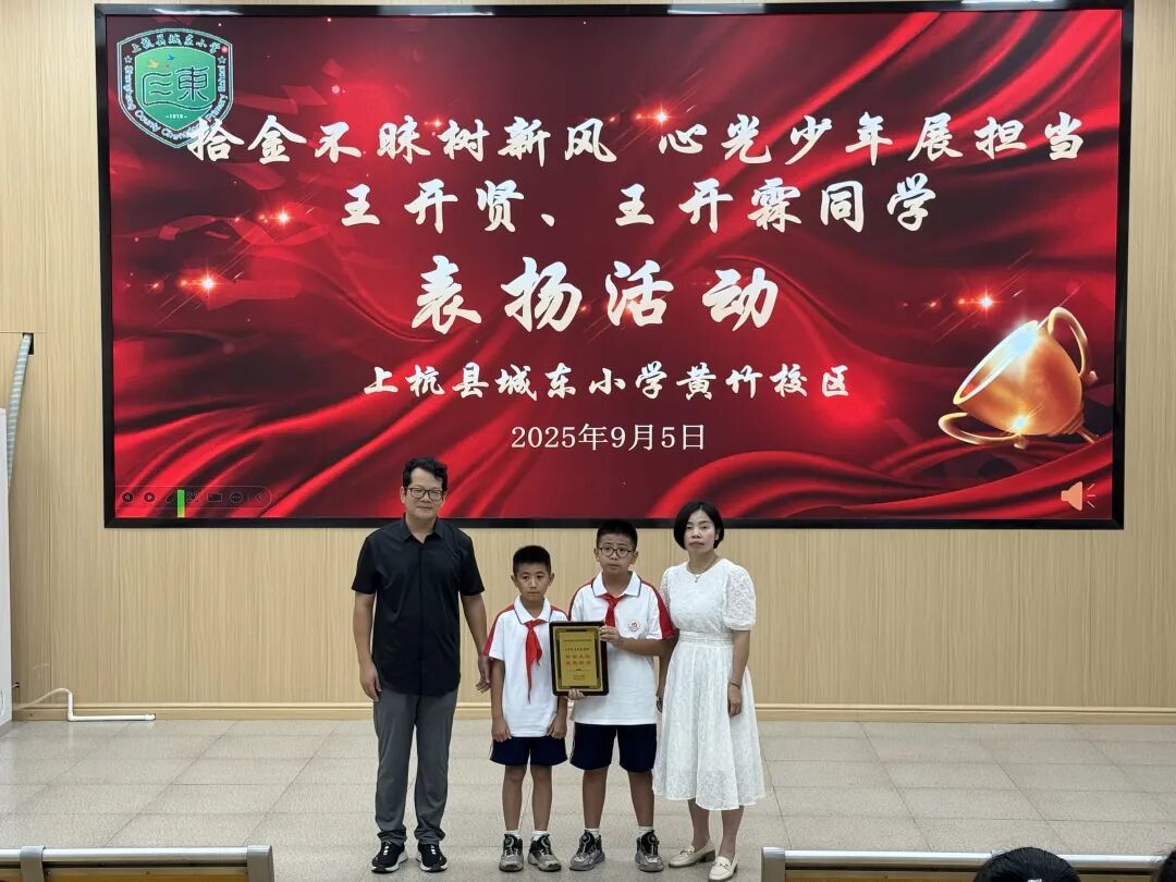 8月31日下午,上杭县城东小学黄竹校区的王开贤、王开霖两位同学在金秋公寓游泳池内游泳时,意外捡到一条金项链。两位同学没有丝毫犹豫,第一时间将项链送至服务前台,工作人员随即联系到失主,最终成功将物品归还。 9月5日上午,失主龚女士和她的丈夫张先生专程来到上杭县城东小学黄竹校区,向王开贤、王开霖两位同学表示感谢,并给他们赠送了一块精美的感谢牌匾。失主向孩子们连连道谢,称赞他们小小年纪却有如此高尚的品德。孩子们却腼腆地说:“这是我们应该做的,不是自己的东西不能要?!?/span> 在面对贵重物品时,王开贤、王开霖同学展现出的拾金不昧精神,不仅是个人品德修养的体现,更彰显了城东小学良好的德育教育成果,为其他同学树立了优秀榜样。这种诚信、善良的品质,值得我们所有人学习与赞扬。 |