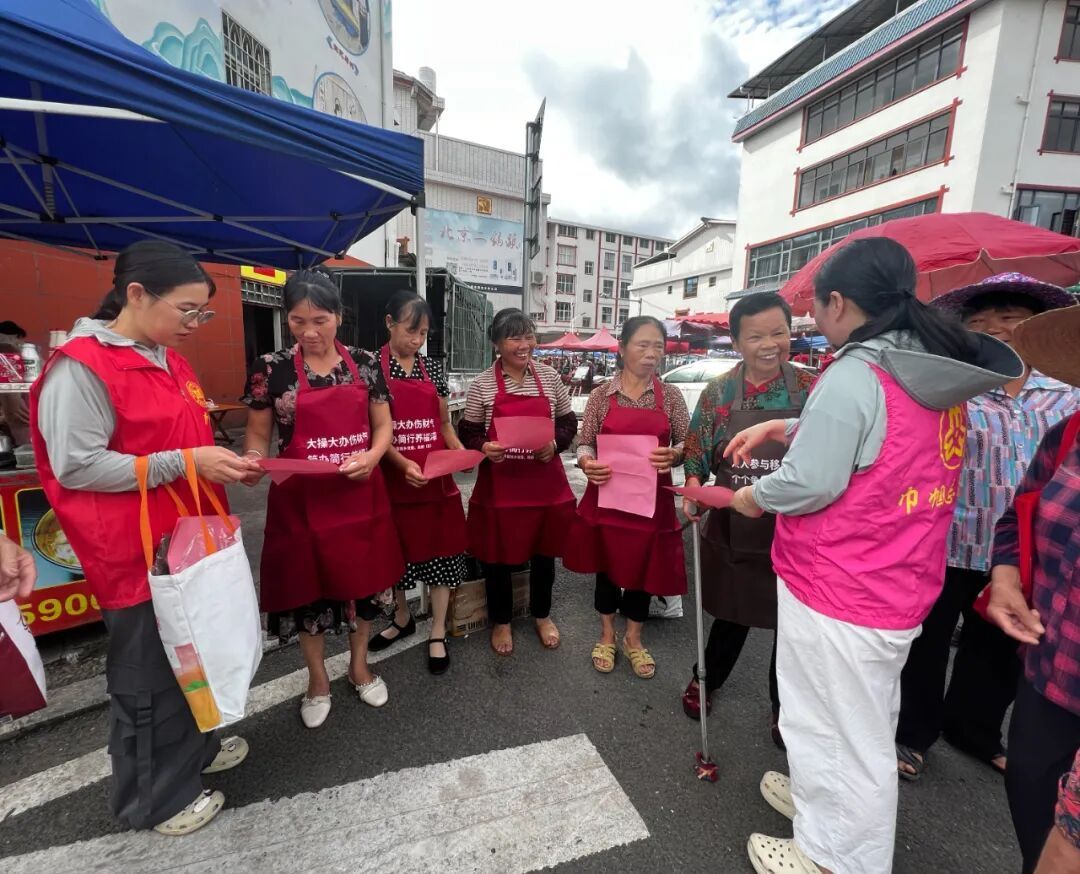 同时,志愿者还现场向群众发放印有移风易俗标语的宣传围裙,通过“生活用品 + 文明理念”的融合模式,让群众在日常使用中潜移默化接受文明熏陶,进一步扩大宣传覆盖面和影响力。