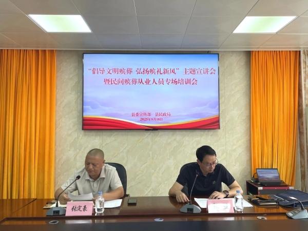 为深入推进移风易俗,弘扬文明殡葬新风,9月18日,上杭县委宣传部、县民政局联合举办“倡导文明殡葬 弘扬殡礼新风”主题宣讲会暨民间殡葬从业人员专场培训会。上杭县民间白事先生、临城镇与临江镇村居红白理事会成员、殡葬服务机构从业人员及各乡镇民政办干部等40余人参会,共学政策要点,共商新风实践。
