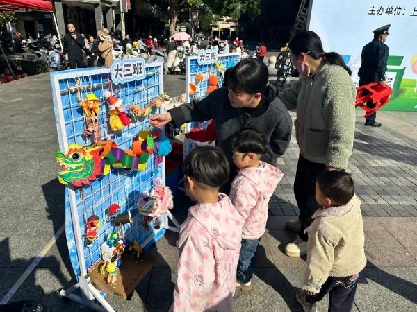 活动现场设置了亲子手工作品展示区,展出了幼儿与家长利用废旧材料共同制作的“变废为宝”手工木偶。一件件充满创意与童趣的木偶,生动体现了垃圾分类与资源再用的意义,吸引了不少孩子和家长驻足欣赏。